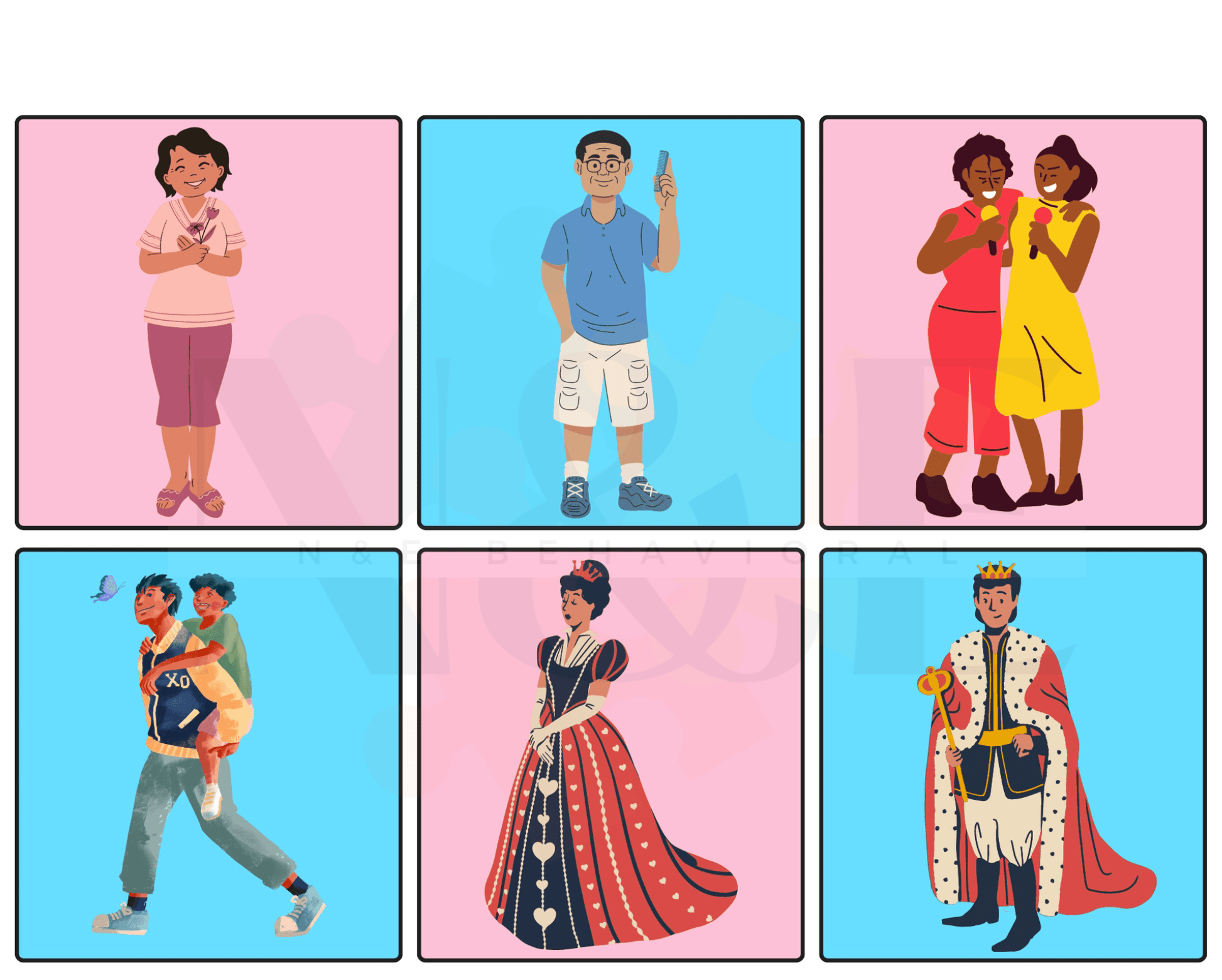Girl and boy matching activities involve pairing images of girls and boys based on visual characteristics such as clothing, hairstyle, or facial features. These activities help individuals with autism spectrum disorder (ASD) develop visual discrimination skills and promote gender recognition in a fun and engaging way.